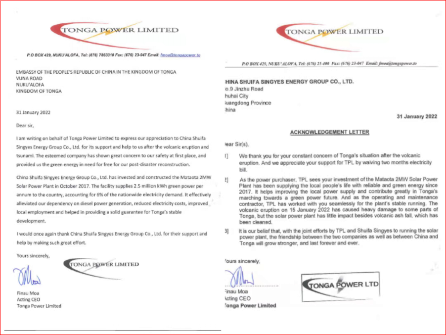 近日,湯加電力公司(Tonga Power Limited,以下簡稱“TPL”)向中國駐湯加大使館及水發興業能源集團發來感謝信,對企業持續關注湯加受災情況并提供有力支持表示感謝。